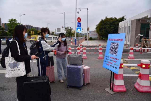 学生入校前,必须手机扫码,出示健康码,然后接受测温检查并换上新口罩。一旁的工作人员同步对其行李进行消毒。这是565net必赢客户端学生返校入园前的“三部曲”。