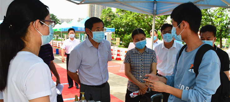 本网讯 5月18日是第一批毕业生返校的时间。当天上午,肇庆市副市长陈宣群来到必赢官网,检查指导学生返校疫情防控工作,强调要以学生的健康安全为重,坚守岗位,落实责任,为学生返校提供健康安全保障。校长吴业春、校党委副书记谢冠华陪同检查。
