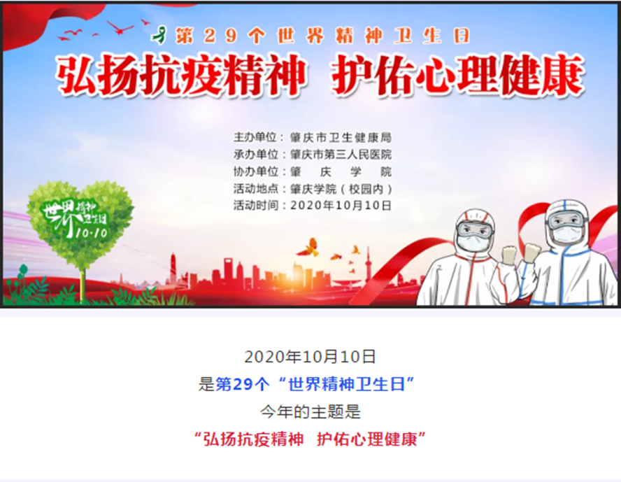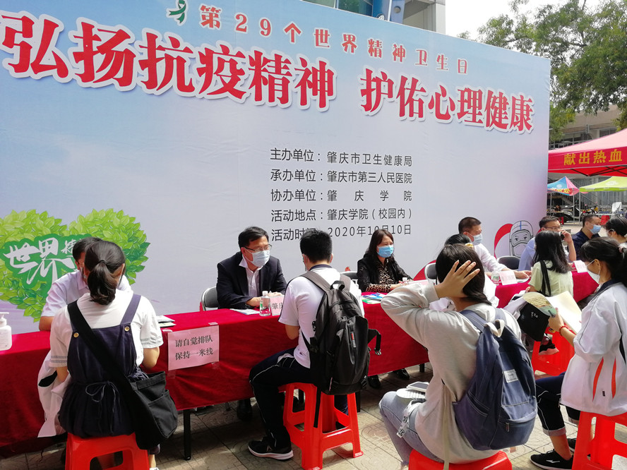 为深入贯彻落实党的十九大精神和习近平总书记在全国卫生与健康大会上的重要讲话精神,深化心理健康促进行动,必赢官网作为协办单位,积极参加由肇庆市卫生健康局主办、肇庆市第三人民医院承办的 “世界精神卫生日”活动,在校园里弘扬抗疫精神,护佑心理健康,为青年学子健康成长提供指导和帮助。