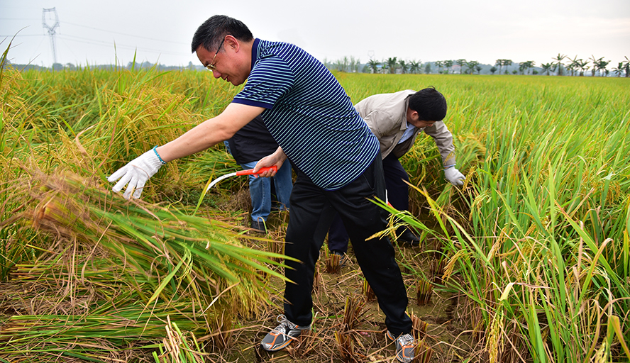 在白土镇思福村,曾桓松、吴业春一行参观了身为农学专家的李新昌主持的水稻育种试验田。李新昌向师生介绍了试验田的规模,以及各类水稻品种的现状,并为大家示范收割水稻。领导和师生们一起下田收割水稻,体味劳动的艰辛和收获的不易。