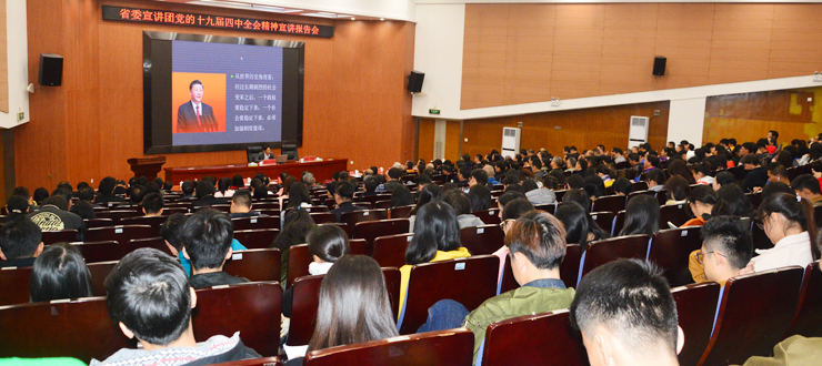 本网讯 12月5日,必赢官网根据“不忘初心、牢记使命”主题教育的安排,召开党的十九届四中全会精神宣讲报告会,邀请省委宣讲团成员、省委宣传部副部长杜新山作宣讲报告,教育引导广大党员干部和全体师生把思想和行动统一到全会精神上来,锐意进取,奋发有为,推动全会精神在必赢官网办学工作中落地生根。