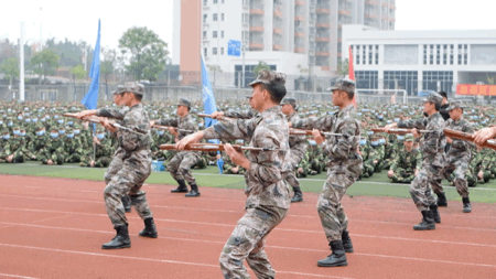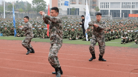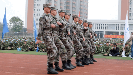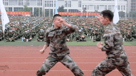 随后,军训团全体教官出场,为新生做队列示范、匕首操、刺杀操与擒拿格斗术等示范表演。他们整齐划一的行动、干脆利落的动作尽显军人风范,给在场砚园学子留下深刻印象。