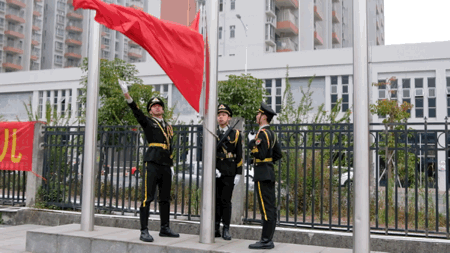 在庄严的国歌声中,国旗班升起五星红旗。随后,谢冠华为2020级军训团授旗,校武装部部长、2020级军训团团长黄镜辉接过并挥动旗帜,为本次军训吹响号角。